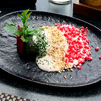 Finas laminas de arrachera marinada y sellada a la parrilla, bañada en salsa ponzu a base de bruja y salsa tatemada, aceite de ajo y bombones de aguacate.